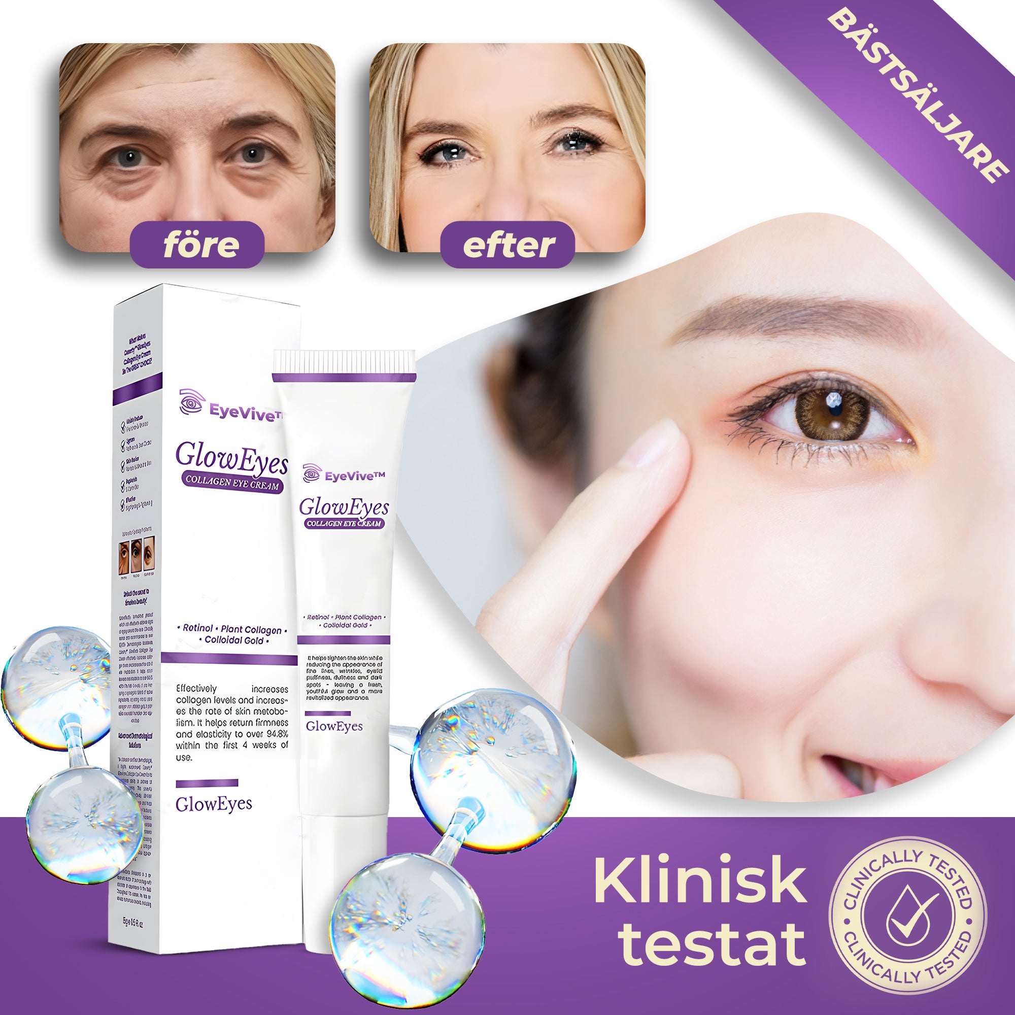 EyeVive™ fungerar genom att kombinera retinol, växtkollagen och kolloidalt guld för att släta ut rynkor, lyfta slapp hud och minska svullnad och mörka ringar. Det återfuktar på djupet, förbättrar elasticiteten och ljusar upp området under ögonen, vilket ger synliga resultat på bara 9 dagar.